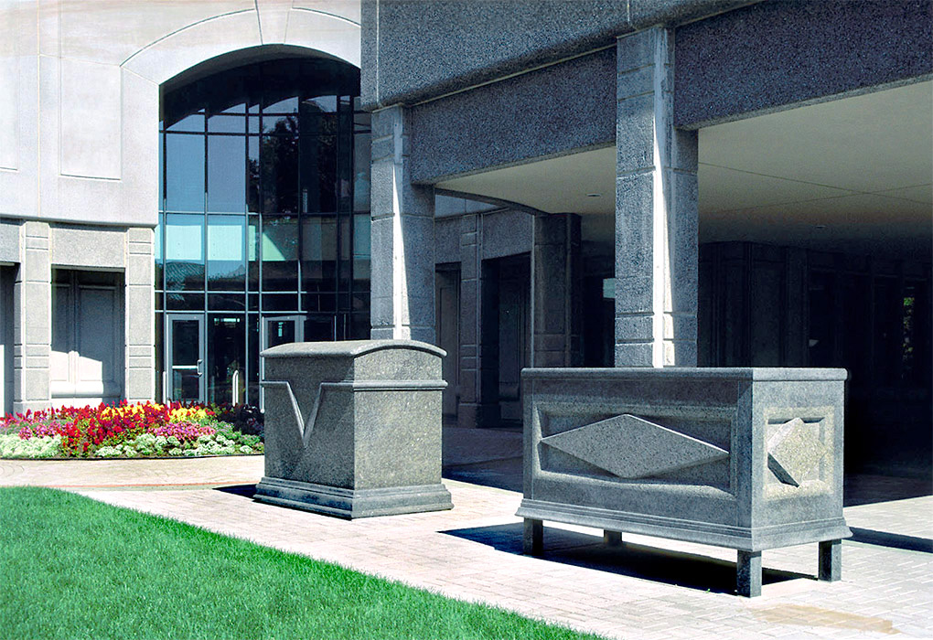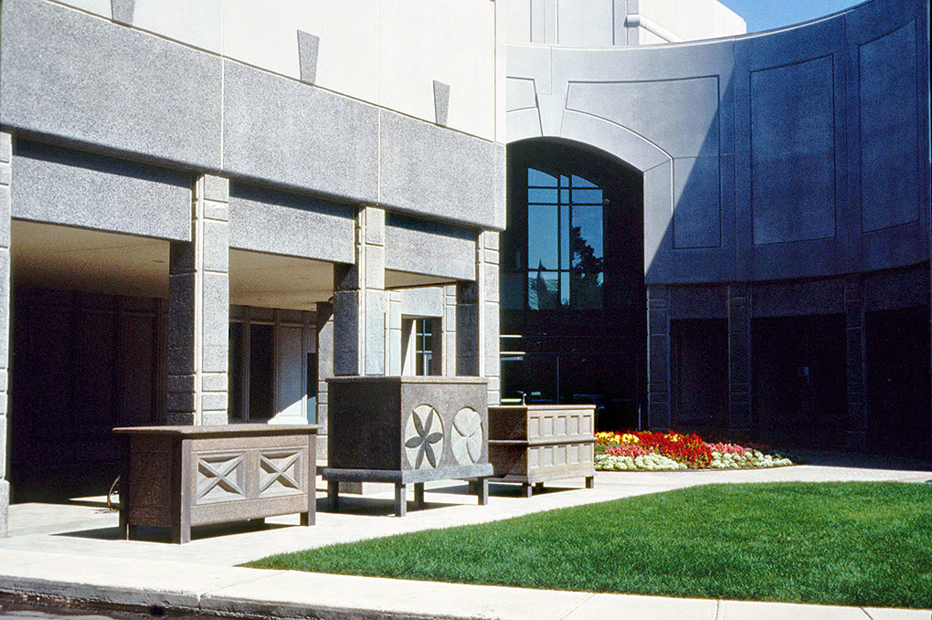 Cinq coffres en granit surdimensionné et placés à l’extérieur du musée interpellent le visiteur dès son arrivée. Chacun des coffres est sculpté de motifs décoratifs que nous retrouvons sur les coffres traditionnels québécois. L’œuvre se poursuit à l’intérieur dans le hall où les empreintes de chacun des coffres marquent le dallage. Dans la perspective du lieu muséal, la symbolique du coffre fermé représente l’élément de conservation, élément évocateur s’appuyant sur le fait qu’on y dépose quelque chose. Ouvert, il est l’équivalent d’une révélation.