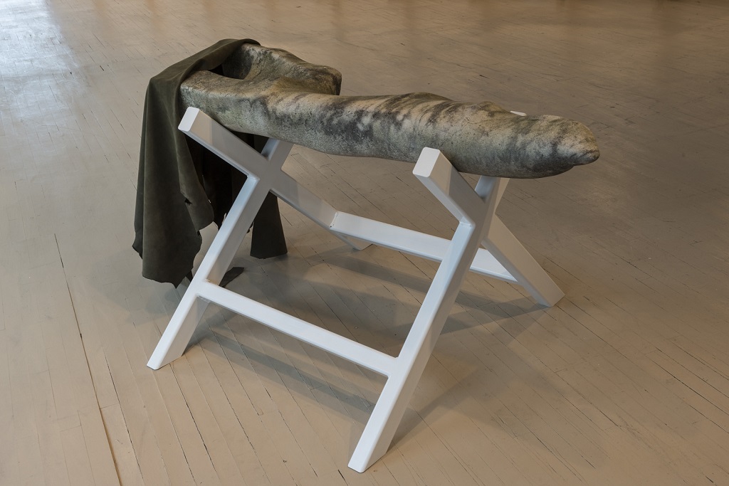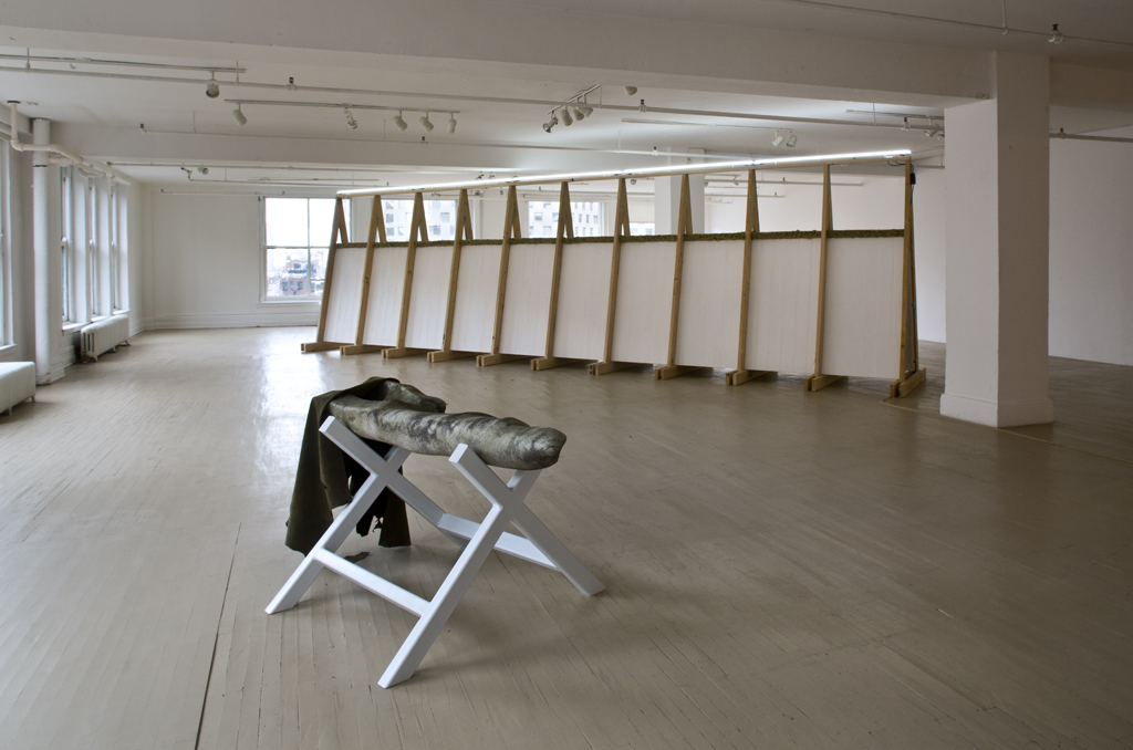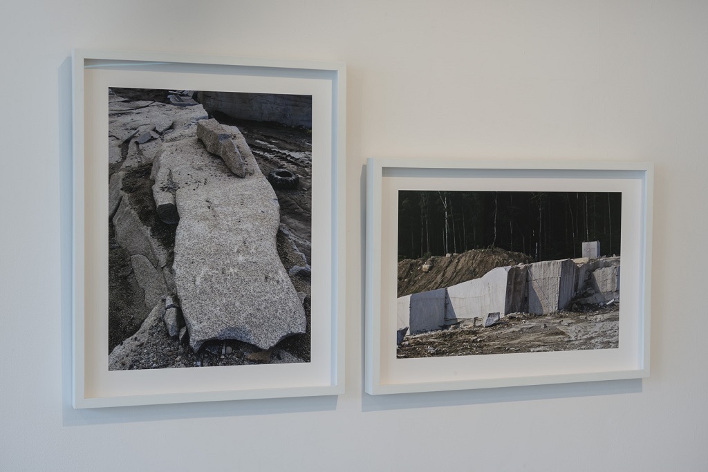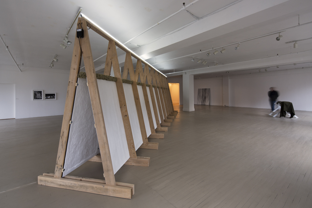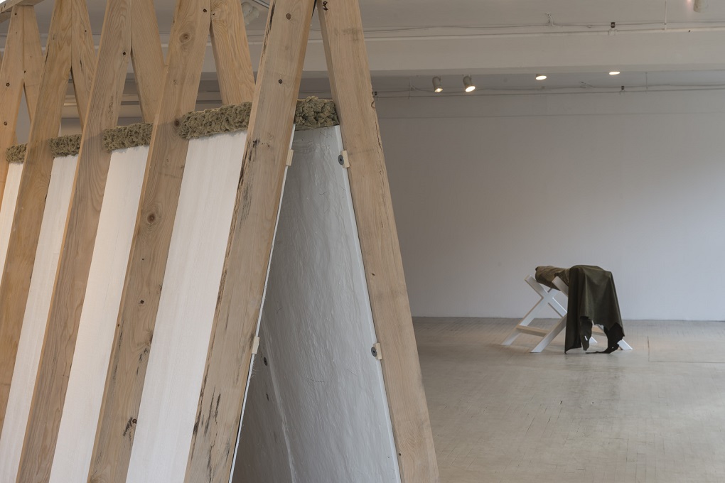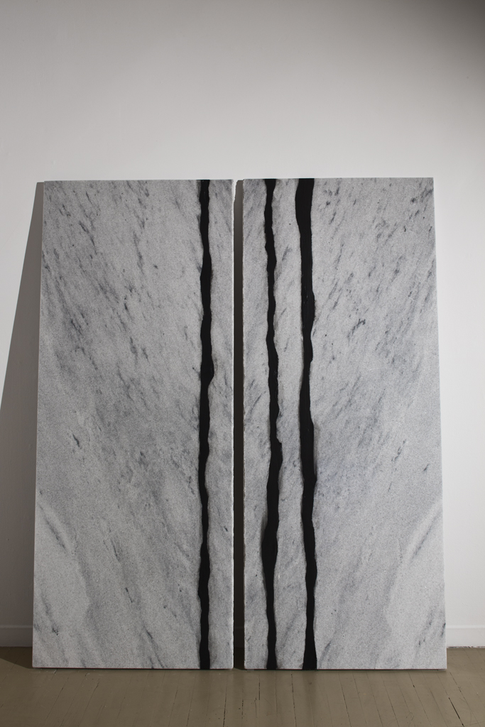 Je désire investir l’espace d’exposition en m’emparant d’expériences liées principalement à la sculpture, à l’architecture et au paysage en rapatriant différentes explorations qui ont jalonné mon parcours récent dans le travail dédié à l’art public. Échelle de reproduction, objets dupliqués, pierre de taille comme modèle d’extraction et de métamorphose. Je m’intéresse pour ce projet d’installation aux éléments d’un vocabulaire formel tiré du monde minéral. Paysage de carrière, falaise, miroirs de marbre. Un assemblage de plusieurs tréteaux de bois de pruche compose un rempart pentu, une vingtaine de tableaux de plâtre réalisés à partir de moulage de planches du même bois reposent dans les interstices escarpés comme autant de feuillets rocheux. A travers cette procédure, la matière transforme en texture, l’articulation du processus même de fabrication. Le plâtre intègre dans sa matérialité une expérience de transformation réalisant cette empreinte fidèle du modèle en bois.