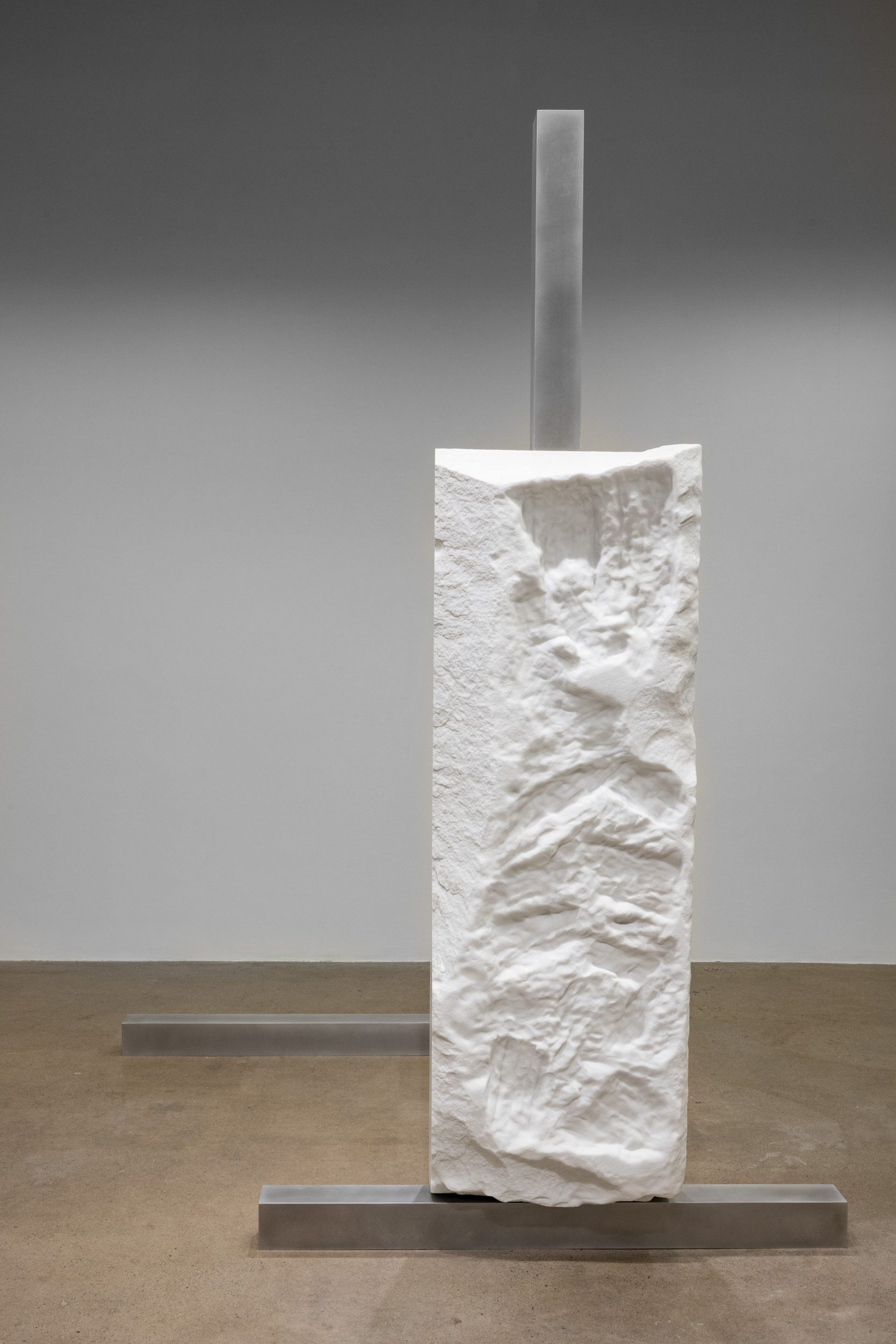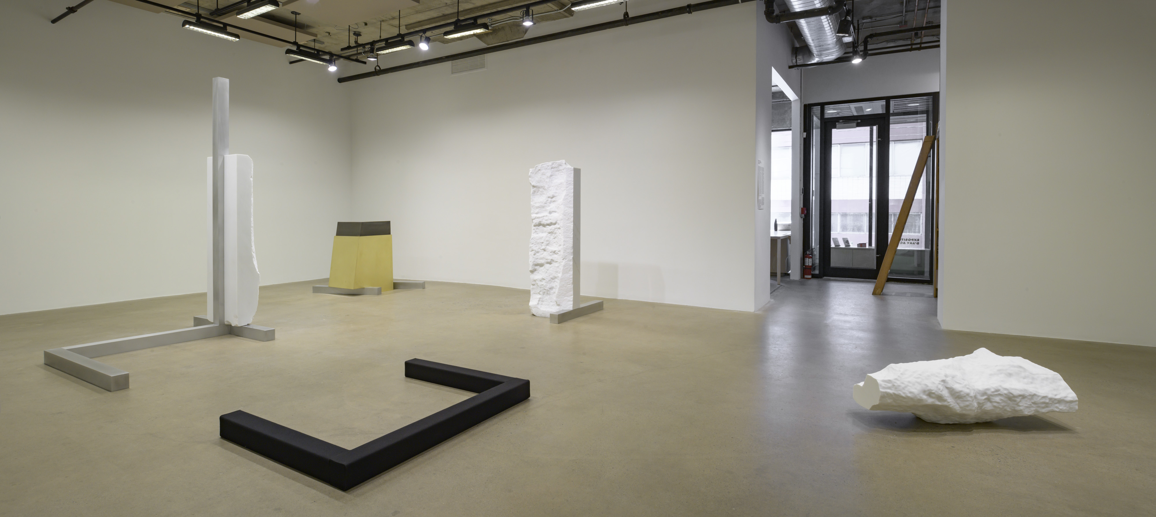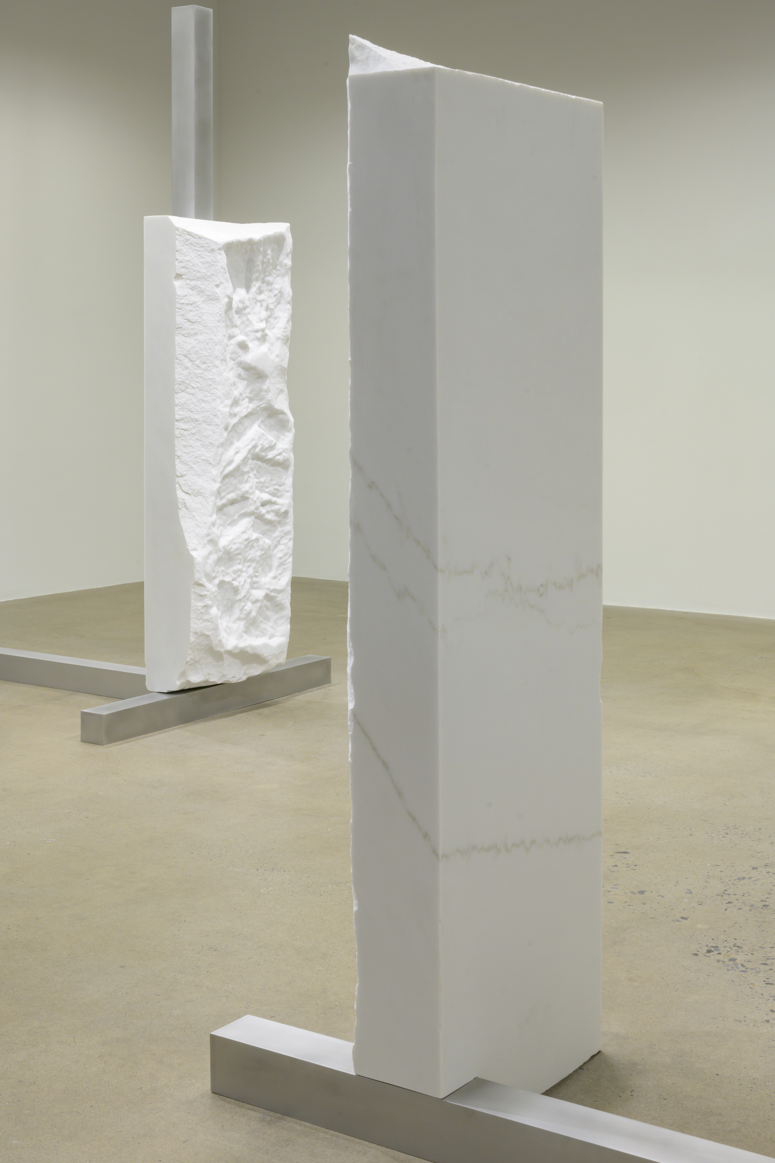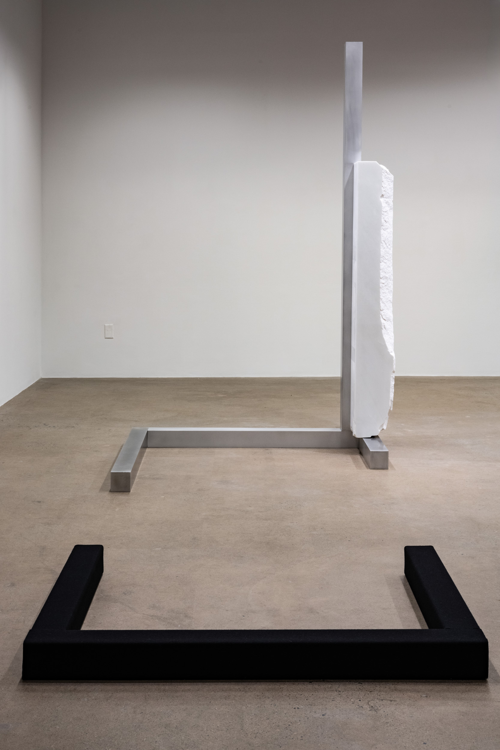 Dans l’exposition, les monolithes de marbre sont présentés à la verticale comme à l’horizontale. Ils sont soutenus au moyen de pièces filiformes d’aluminium — dont certaines sont nappées d’étoffes de feutre. La mise en espace, sorte de trajet balisé de diverses structures monumentales, alterne circulation et contemplation. Les surfaces des parallélépipèdes sont ainsi observables dans leur quasi-intégralité. Des frictions et des tensions sont ressenties parmi les textures tavelées. Les reliefs de gestuelles, élevés en saillie ou creusés en sillon, suggèrent l’érosion des mines d’extraction. La disproportion entre les gestes de prélèvement des matériaux et l’évocation de leur proximité relative avec leur lieu d’origine — malgré leur distance réelle — se ressent dans chacune des œuvres. Un volume doré en laiton poli prend place parmi cet ensemble. La proposition réverbérante se reflète ici et là dans la salle, telle une aura.