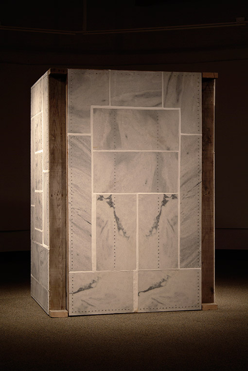 Duplex propose une installation réalisée avec plusieurs blocs de marbre blanc coupés finement en feuilles. Les reliques de marbre sont clouées au montant d’une charpente en bois que j’ai laissé apparente dévoilant l’endos, le revers de l’image en construction. La minceur du marbre sous l’effet de la lumière donne à voir la veine qui se profile dans le blanc de la matière comme un monogramme d’encre esquissant une calligraphie imaginaire. De vieux haut-parleurs fixés à la structure permettent d’entendre les bruits de la salle de concert captés en temps réel.
