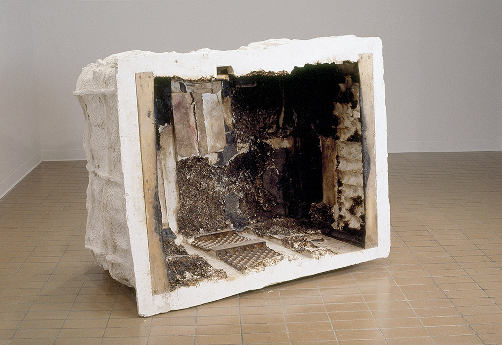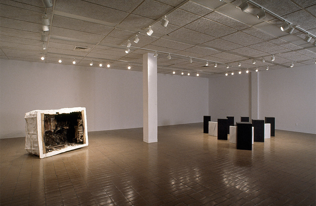 Foyers, Plein Sud Longueuil 2000, je poursuis mon travail autour de cette perception des formes et des espaces intérieurs laissés dans l’esprit de la matière comme un tremblement. Figures opaques et solides enfermées sous le regard unique, cinéma intérieur d’images mises en relief. Je conserve l’idée du travail récent autour de la présence de l’œuvre du feu mais je voudrais davantage l’employer, dans ce nouveau projet, comme un outil conceptuel de la sculpture, taillant dans la masse noire des ombres. Le feu comme élément de la disparition de la forme.