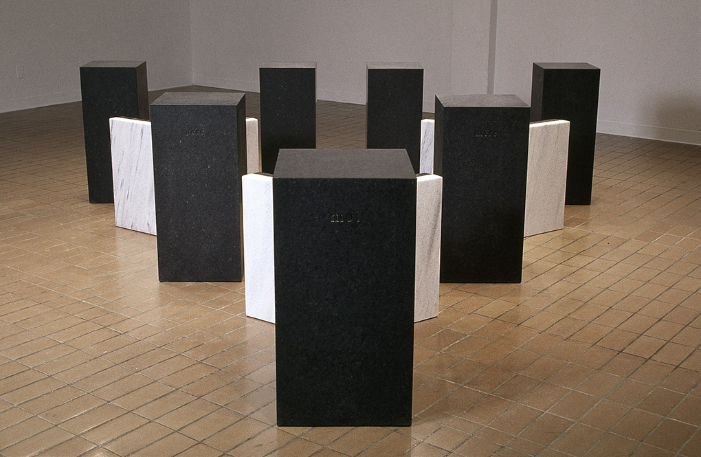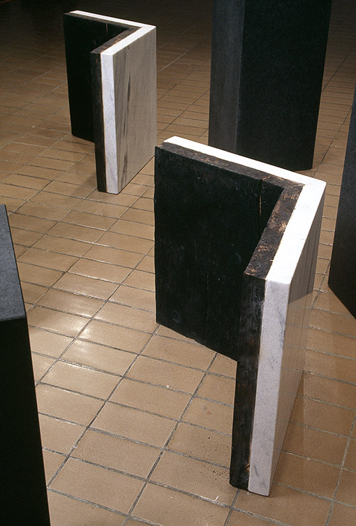 « Deux nouvelles sculptures conçues pour l’expositon à Plein Sud reprennent des thèmes et des formes explorés au cours des dernières années. « Éclipse » imposant bloc évidé, montre dans sa cavité les traces de matières qui l’habitaient jadis avant que le feu les consume. On ne peut regarder cette sculpture sans imaginer le processus dont elle résulte, sans se figurer les flammes qui ont pris possession de ce qu’elle contenait et l’on fait disparaître pour toujours. Devant cet objet parvenu à un état final, l’esprit entreprend un voyage rétrospectif, reconstitue l’événement. L’autre œuvre de l’exposition intitulée « Cendres » entraîne le spectateur dans une aventure temporelle. Sept blocs de granit disposés à la verticale, réunis entre eux par des éléments de marbre et bois brûlé crée une enceinte. Cendres reprend des thèmes explorés dans l’exposition blancs (Dazibao, 2000) à laquelle marie-france brière avait collaboré étroitement avec Barbara Claus. »