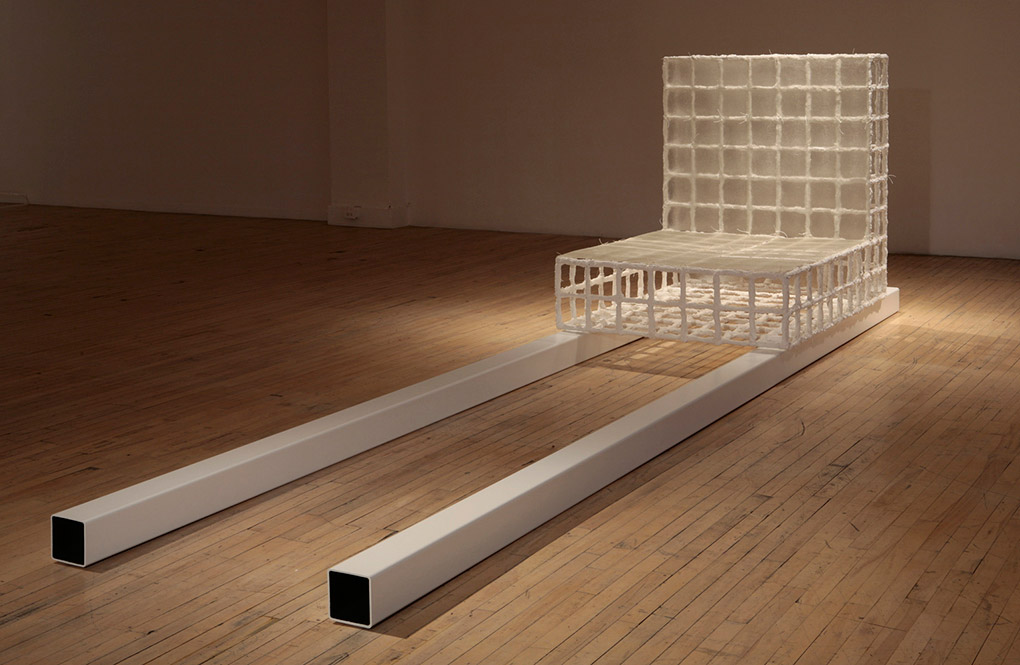 Habiter dans la bouche des formes, Circa 2007 présente un projet où matière et voix s’organisent pour constituer un nouvel ensemble de sculptures accompagné d’une bande sonore. Élaborer à la frontière de l’écriture et de l’image, une volumétrie de l’intention, un moment qui se déroulerait entre dire et faire. Travailler sur l’équilibre et le précaire en poursuivant ma réflexion entre tension et gravité, souplesse et architecture dans un espace mettant en scène la voix imaginaire des formes.