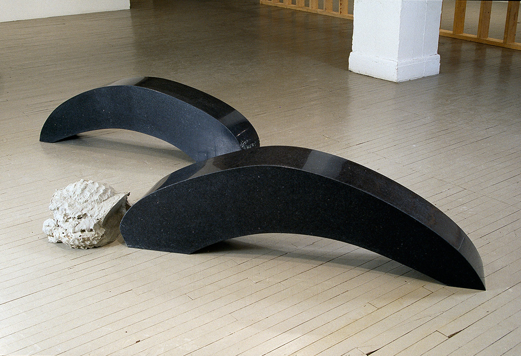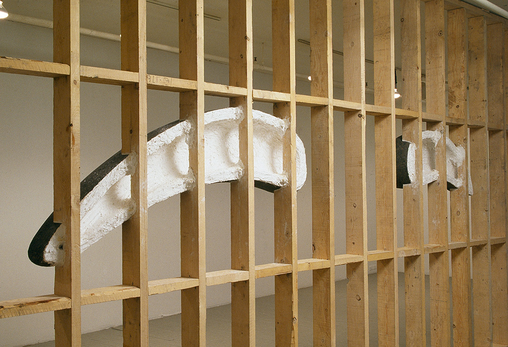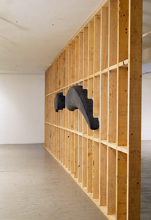 Prégnance, Gallerie Christiane Chassay 1996, est composée principalement de deux pièces disposées selon des modalités précises utilisant les surfaces architecturales du lieu d’exposition. Engramme d’une chute, poids imaginaire des formes déliées de leur gravité. Amalgame de la pierre et du plâtre, découverte de l’endos, esquisse d’une image fondamentale. Fluctuation des figures sur le fond, de l’image évanescente et de la forme dure, du blanc et du sombre.